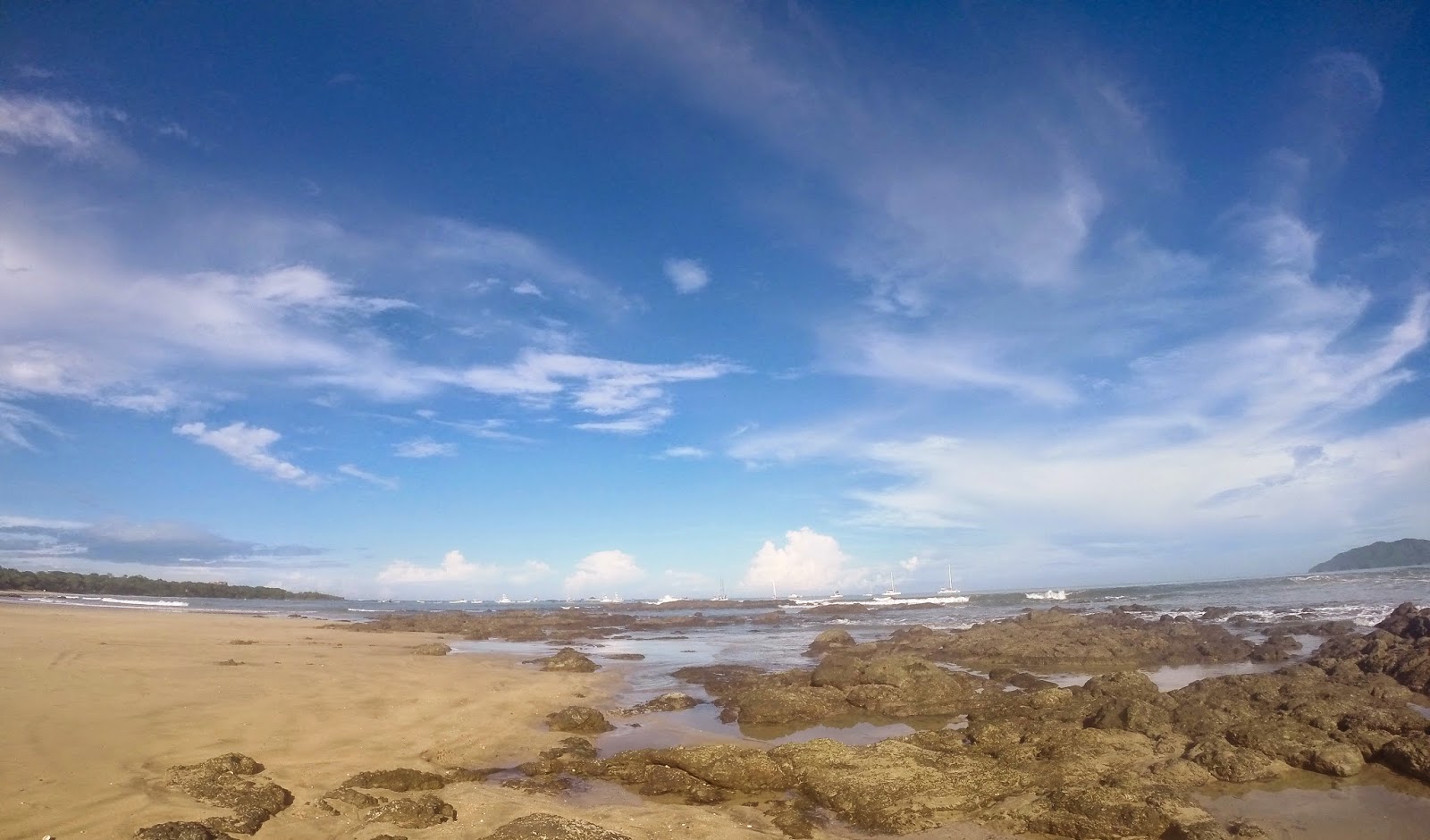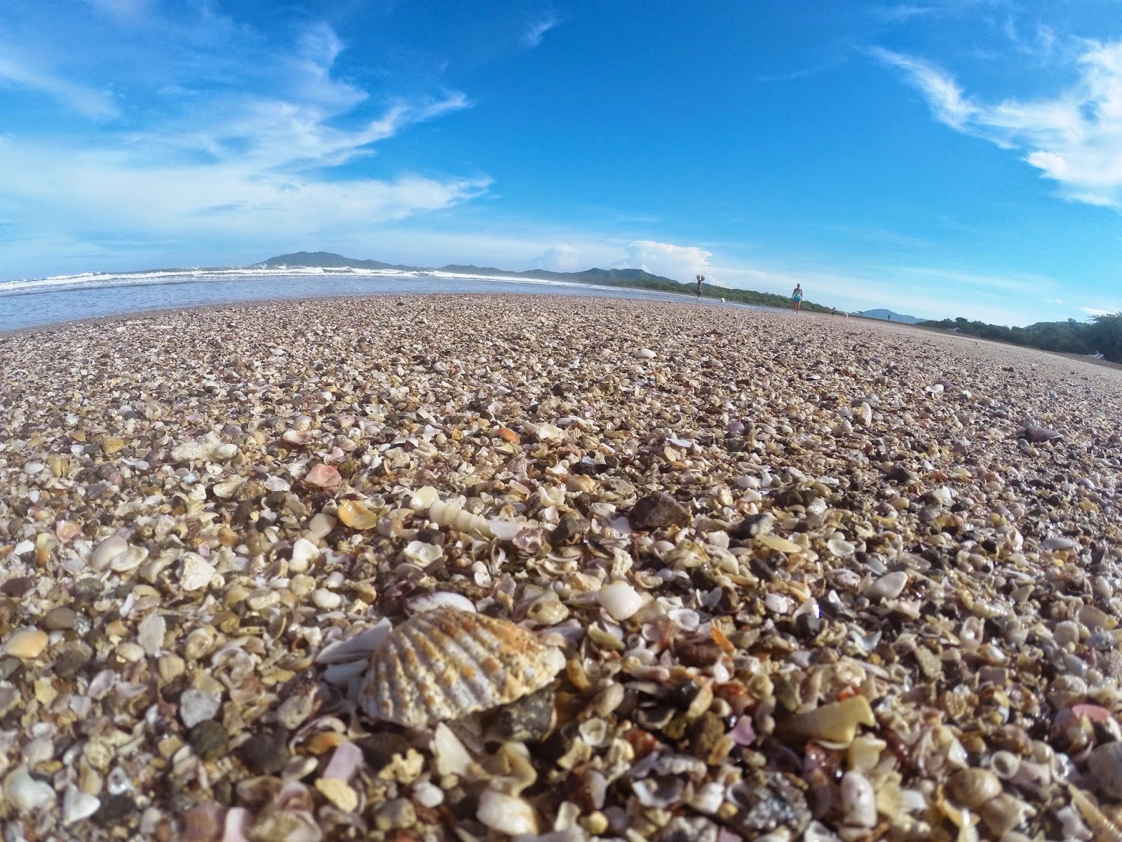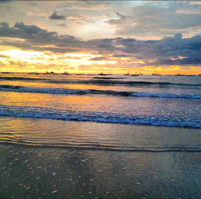 Extensa de arena oscura llena de conchas y caracolas. El océano pacifico en esta playa se ve verde oscuro y cuando estas en el agua no se ve el fondo. El escenario de la playa en el atardecer es una mezcla del Pacífico, los barcos en el horizonte, los colores del mar y del sol hundiéndose en el agua, un escenario alucinante.