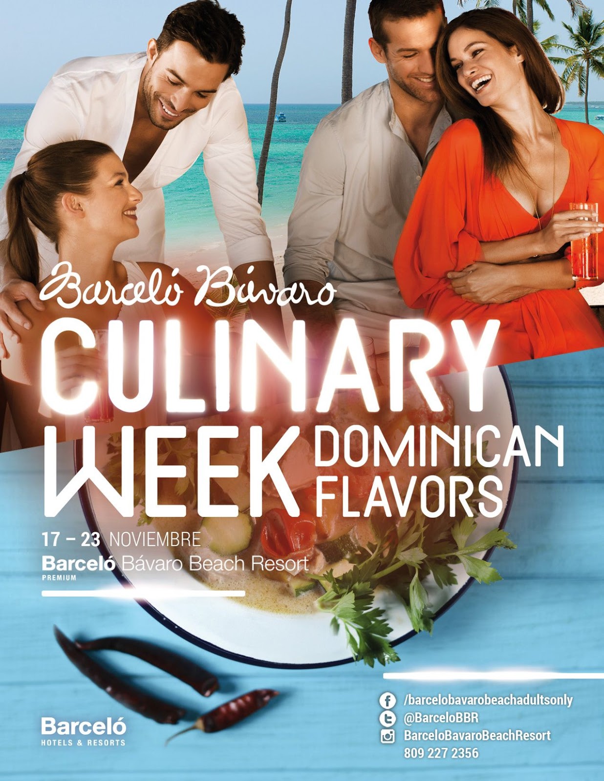 La Barceló Bávaro Culinary Week, Dominican Flavors es un evento en el cual luce el talento culinario dominicano. En esta oportunidad un conjunto de destacados chefs dominicanos fueron seleccionados por sus habilidades, conocimientos y capacidades de comunicación para el desarrollo de cada una de las actividades de ésta semana Gastronómica en el Complejo Barceló Bávaro Beach Resort, ofreciendo un variado programa de actividades a llevarse a cabo del 15 al 22 de noviembre: desayunos, almuerzos y cenas de alta cocina dominicana, catas y degustaciones de cerveza y ron. Contará además con cocina y coctelería en vivo.