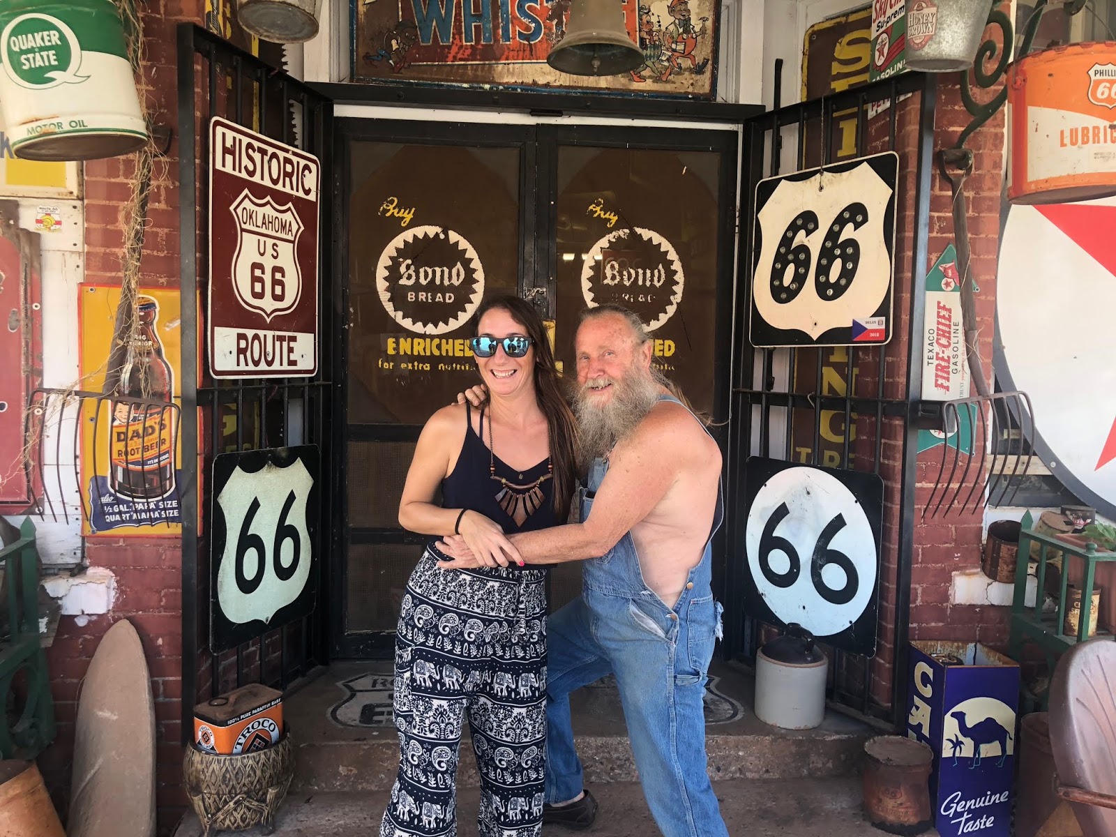 Una parada curiosa imperdible fue en Erik, donde se encuentra nuestro amigo Hurley. Este señor lleva años viviendo y regentando un local lleno de señales antiguas de la ruta 66. Algunas señales tienen balazos, hay fotos, y la visita es toda una experiencia. Hurley es una personaje que te puede sorprender cantándote, contándote historias de su difunta historia o solo haciendo chistes y vacilando tu visita, en nuestro caso, me tocó a mi ser el punto de las risas ya que parece que este señor se enamoró momentáneamente, véase la foto.